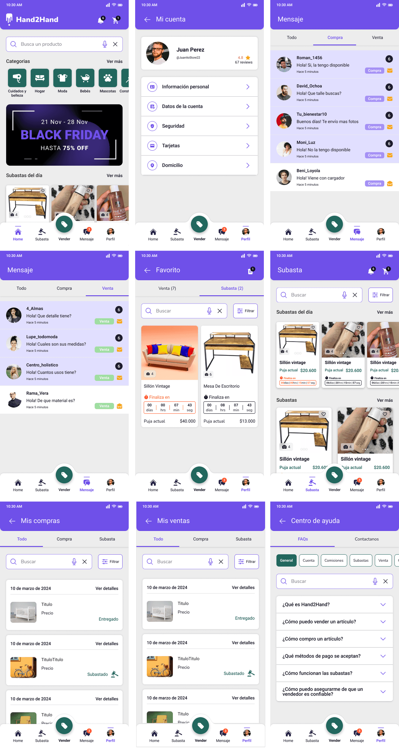 Interfaz Adaptativa: La app permite cambiar de rol (Comprador/Vendedor) manteniendo una estética limpia con una paleta de violetas y blancos que transmite modernidad y confianza.